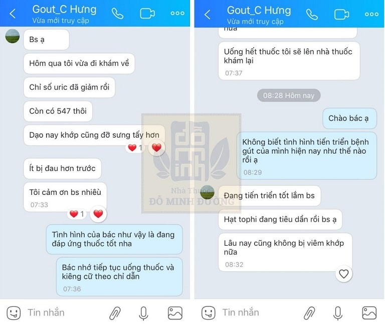 Không dừng lại ở việc kê đơn, các lương y tại Đỗ Minh Đường còn sẽ luôn đồng hành cùng bệnh nhân trong quá trình điều trị. Phòng khám sẽ định kỳ nhắn tin, gọi điện thăm hỏi tình hình dùng thuốc, tiến triển và hướng dẫn phù hợp cho từng giai đoạn điều trị. Vì vậy, người bệnh gout có thể yên tâm sử dụng thuốc và được đồng hành cho đến khi kiểm soát bệnh và ổn định sức khỏe. |